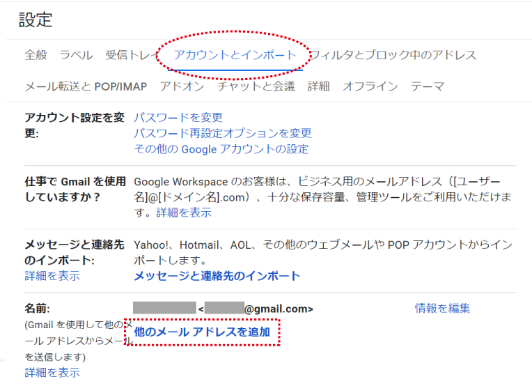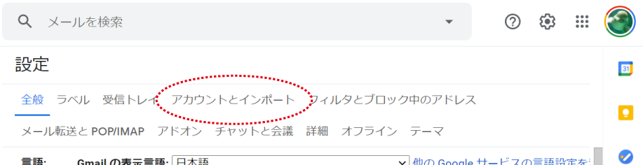 大学や会社管理や、有料サービスをお使いの場合、「アカウントとインポート」がなくて「アカウント」と書かれていることがあります。この場合は、Gmailから形メールを送信できません。