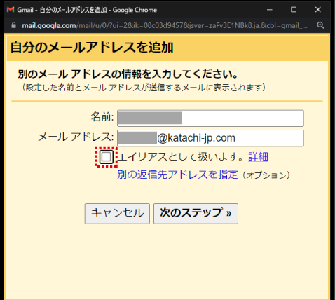 ※ 「エイリアスとする」の場合、形の科学会メールアドレスは受信専用です。送信はGmailのアドレスのみになります。